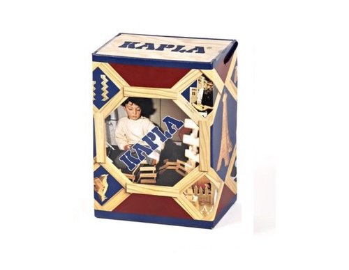 Die KAPLA- Box enthält 200 dieser Pinienholz- Plättchen und ein Anleitungsheft mit40 Abbildungen.